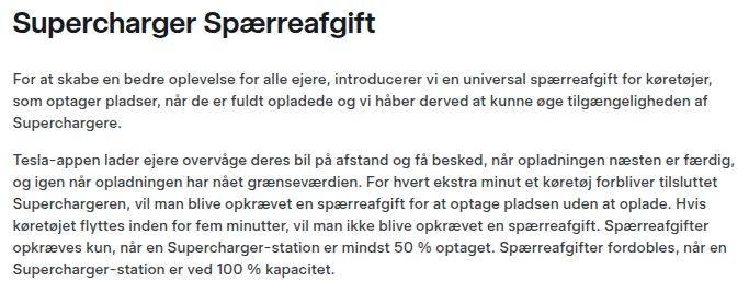 "Spærreafgifter opkræves kun, når en Supercharger-station er mindst 50 % optaget. Spærreafgifter fordobles, når en Supercharger-station er ved 100 % kapacitet."