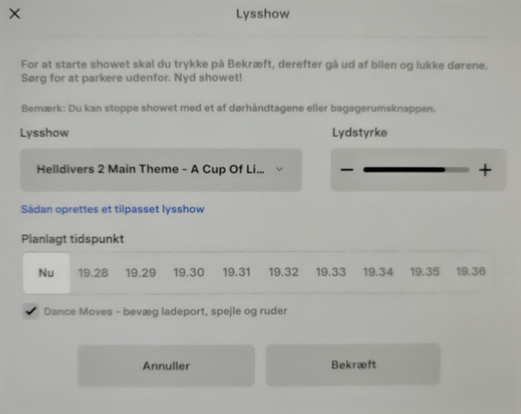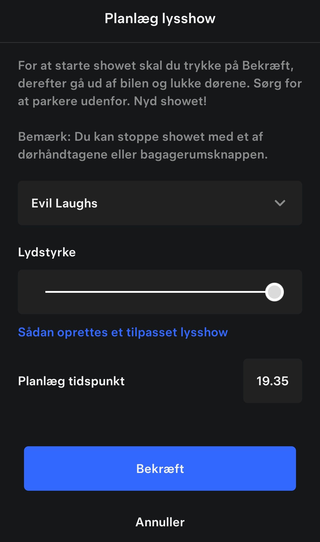 Tryk på bekræft for at starte lysshowet. Du skal forlade bilen, og lukke alle døre, før det starter.